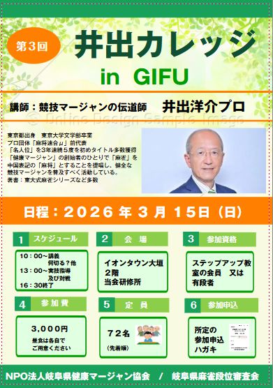 文化交流大会として「健康マージャン」も10月19日(日)~20日(月)の2日間にわたり大垣市の総合体育館で開催されます。